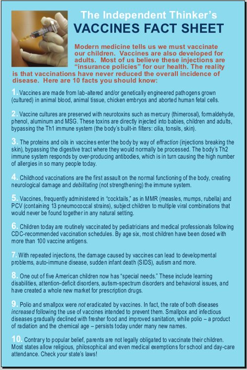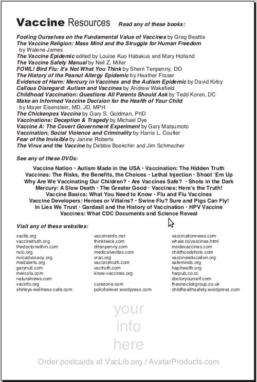 is a postcard listing 10 essential but little known facts urgently needed by friends, neighbors and community members so they can make the only "informed choice - complete avoidance and refusal."