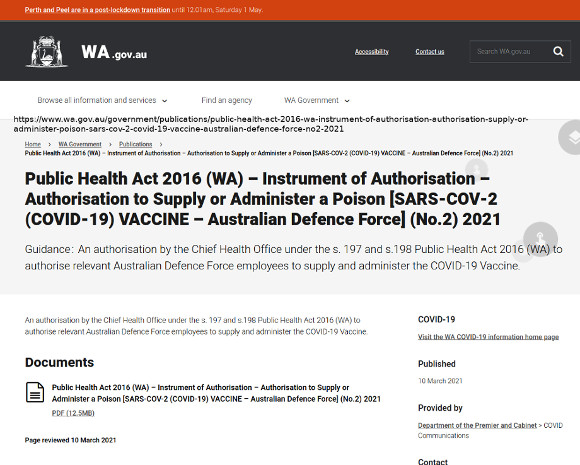 ![]() ![]() ![]() Spotted outside an English Pub. ![]() Click for larger size Originally found at: https://www.wa.gov.au/government/publications/public-health-act-2016-wa-instrument-of-authorisation-authorisation-supply-or-administer-poison-sars-cov-2-covid-19-vaccine-australian-defence-force-no2-2021 Link to PDF file not working 26 April 2021. ![]() From PIC Messaging ...