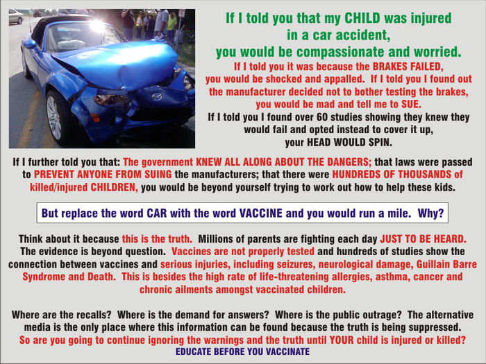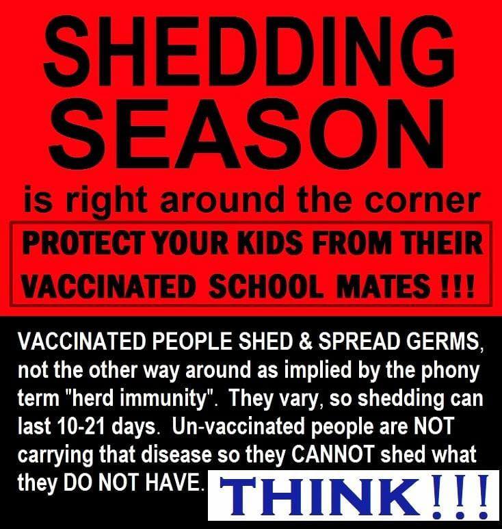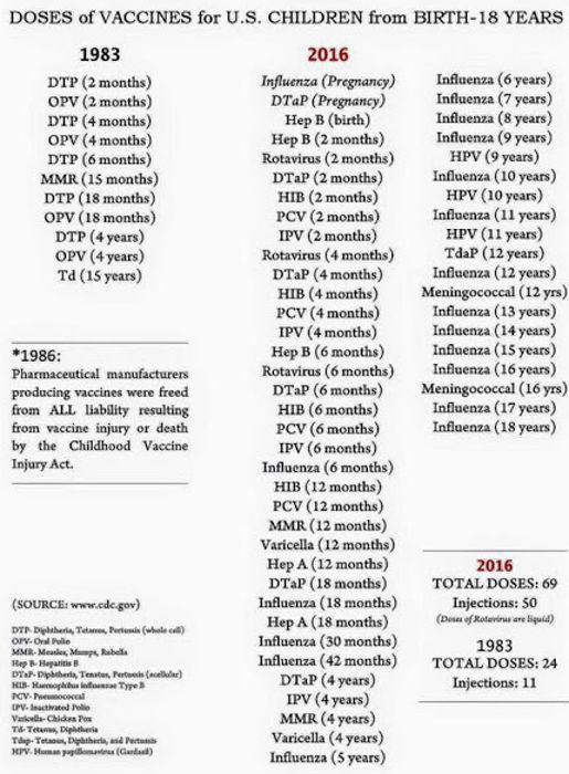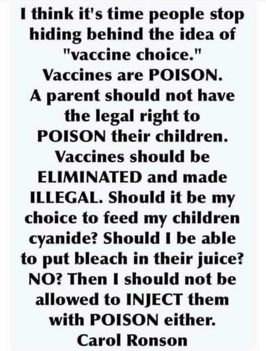 Once our nation stood for 50 independent and cooperative states. Does it now stand for the Military-Industrial--Agri-Chemical--PharmaLord Corporations?![]() In 1983, a total of 11 vaccine injections were given before age 18. For 2016, the schedule calls for 50 injections, 3 oral doses and two more injections given to the mother during pregnancy. Does this expanded schedule produce better or worse health for our nation's children? ![]() Vaccination was created before the scientific method became common. The general belief in vaccination's efficacy has been established by repeated propaganda statements and the scientific method is denied application to the vaccine paradigm. ![]() This slide needs no comment, except that it is true. ![]() ![]() ![]() The image above was found here: https://steemit.com/vaccines/@holisticgreen/shedding-season-is-right-around-the-corner-protect-your-kids-from-their-vaccinated-schoolmates Another image that had a message we imported to VacLib.org site Why is my child always sick? Click to View: Thank you to FaceBook and REALfarmacy.com Original Source: https://www.facebook.com/REALfarmacyCOM/photos/a.474556669294061/1924943484255365/?type=3&theater Another great message imported to VacLib.org site Do parents have the right to vaccinate their children? Click to View: Vaccines Poison Illegal .jpg Original Website posting: Uncertain
